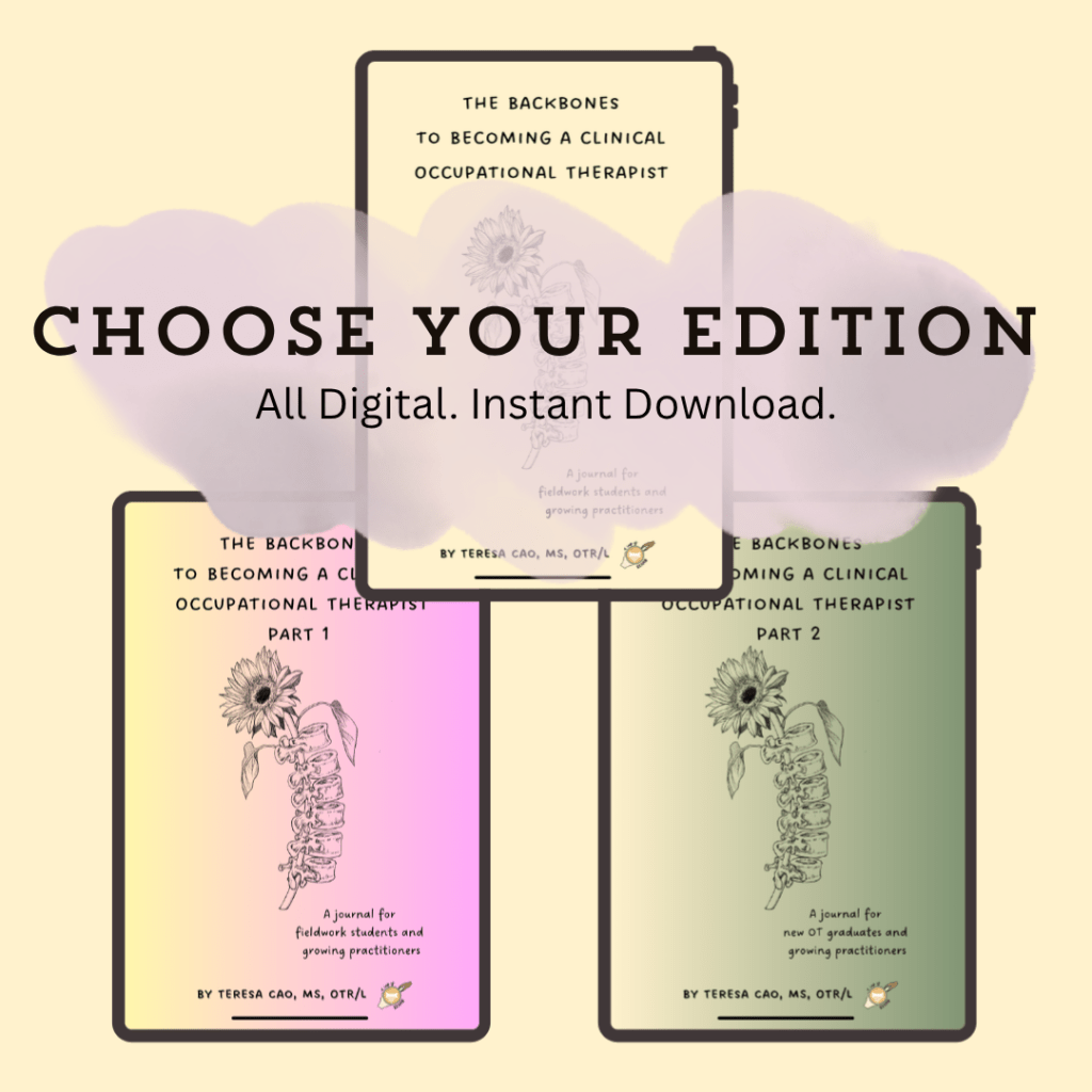 3) Career & Wellness Edition (52 pages) โ Designed for life after fieldwork, including graduation checklists, NBCOT study plans, job hunt tools, and wellness strategies for managing burnout and imposter syndrome.